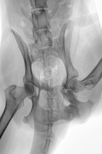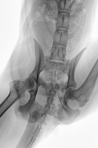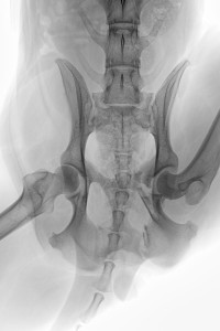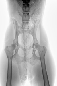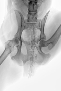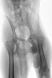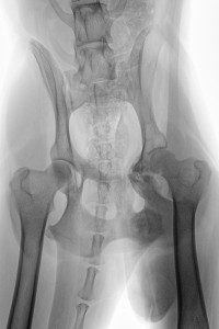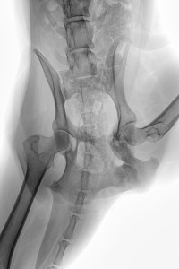 Die Spinone ltaliano Hündin „Ajenna“ gerufen Jenna, geb. April 2013, wk, ist am 06. Oktober 2015 auf der unweit entfernten Bundesstraße vor ein Auto gelaufen und wurde angefahren. Durch den seitlichen Aufprall auf die linke Körperseite kam es zu einem stumpfen Trauma im Brustbereich mit Lungenrissen und das Becken wurde mehrfach frakturiert. Wie auf den RÖ-Bildern zu sehen, war das Schambein verschoben, das Becken gebrochen, aber die größte Sorge machte uns die Fraktur im caudalen Bereich des Acetabulums. Da der Hund das Hinterbein mäßig belasten konnte und die Band- und Kapselstrukturen des Hüftgelenkes scheinbar intakt und nicht gerissen waren (der Femurkopf war nicht luxiert), sah der hinzugezogene Orthopäde von einer sofortigen OP ab und wollte zunächst den Heilungsverlauf beobachten.