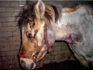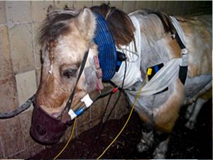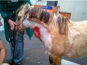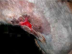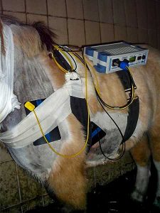 Mogli wurde in der Klinik für Pferde (Chirurgie), JLU Gießen, auf Grund eines drei Tage alten Spritzenabzesses, verursacht durch eine paravenös verlaufende Injektion vorstellig. Die Wunde stellte sich großflächig von der linken bis zur medialen Halsfläche dar. Die linke Vena jugularis (äußere Halsvene), die Arteria Carotis (Halsschlagader), die Trachea (Luftröhre) sowie der Oesophagus (Speiseröhre) waren freiliegend. Der Ösophagus war ca. 1,5 cm eröffnet, dadurch bedingt trat aus der großflächigen Wunde abgeschluckter Speichel sowie Speisebrei aus. Ansonsten befand sich Mogli in einem mäßigen Allgemeinzustand. Mogli wurde ab sofort über eine Nasenschlundsonde ernährt und erhielt zusätzlich an Medikationen: Metacam®, Cobactan® und Gastrogard®. Am 5. Tag des stationären Klinikaufenthaltes begannen wir mit der Interferenzstrom- Regulationstherapie. Ziel Unterstützende physikalische Behandlungstherapie zum Zwecke der Schmerzlinderung sowie Abheilung der Öesophagusschädigung und der großflächigen Fleischwunde durch Anregung des Zellstoffwechsels als auch der Abtransport von Gift-und Schlackestoffen durch Anregung der Lymphtätigkeit.