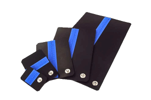 Die Plattenelektroden bestehen Siliconkautschuk und somit wesentlich flexibler (anpassungsfähiger) als Kunststoffplatten. Die aufgenähten Klettbäder ergeben in Verbindung mit den Flexbändern einen rutschsicheren Halt. – erhältlich in folgenden Größen*: